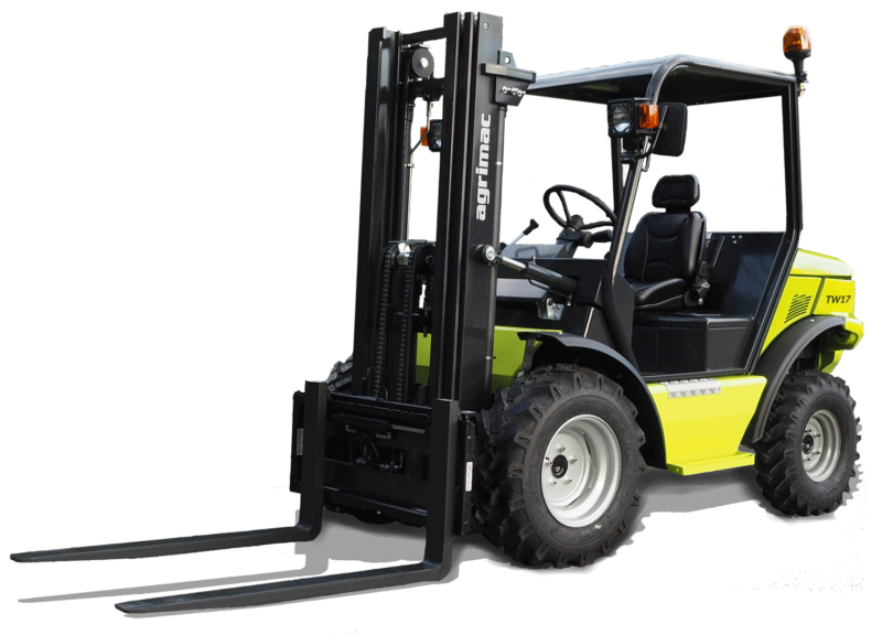 La carretilla elevadora Agrimac TW17 es la conversión del modelo TH-175 a la transmisión de motor intrarrueda 4×4. Conserva el diseño compacto, la gran altura libre al suelo y tracción 4×4: Eso sí, mejorada porque la tracción todoterreno distribuida en motores intrarrueda es más eficiente y segura que la de los puentes diferenciales.