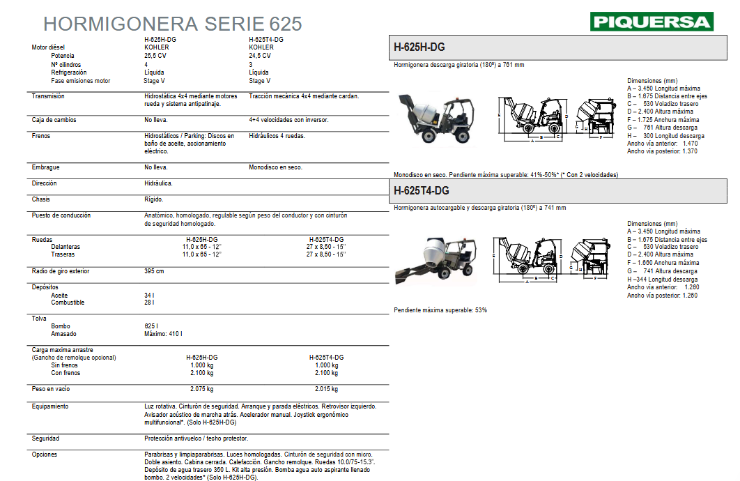 HORMIGONERA autocargable. Tracción doble. Motor KOHLER, 24,5 CV, tres cilindros. Refrigerado por agua. Descarga hidráulica giratoria entre 180º. Dirección hidráulica. Frenos hidráulicos a las cuatro ruedas. Arranque y parada eléctricos. Capacidad bombo 625 l. Capacidad de amasado 410 l. Bulón de arrastre. Techo protector. Luz intermitente superior. Cuenta horas. Avisador acústico de marcha atrás. Acelerador manual. Cinturón de seguridad.