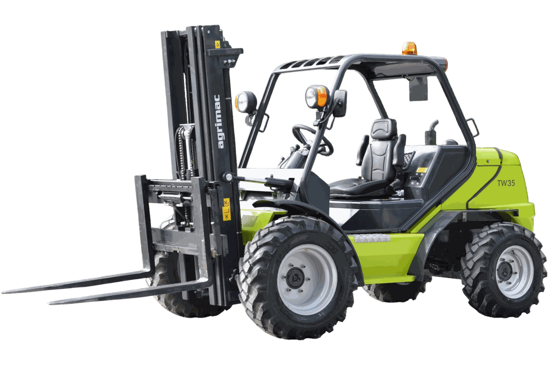La carretilla elevadora TW35 es un modelo hidrostático capaz de elevar 3.500 kilos de peso a una altura de seis metros. Tiene dos opciones de motor térmico en función del lugar de uso de la carretilla. Para la Unión Europea equipa un motor Kohler de 51 CV con DPF. Para fuera de la UE lleva un motor Perkins de 50 CV sin DPF. En ambos casos están equipadas con motores intrarrueda 4×4.